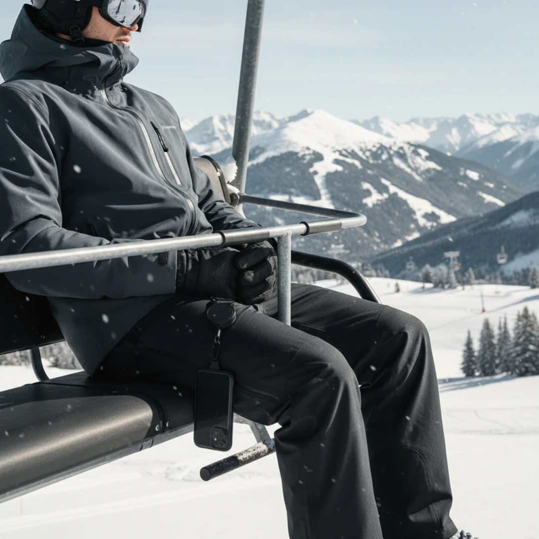 SkiLock fästs direkt i mobilen och sedan i dina skidbyxor, så du alltid har en säkerhetslina mellan dig och mobilen.